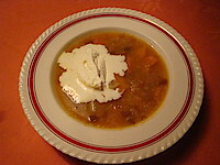 Frugtsuppen serveres med kold flødeskum eller creme fraiche.