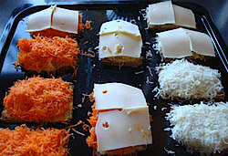 Rist brødet let. Skræl og riv rodfrugterne fint. Smør brødet med et tyndt lag sennep og læg derefter ¼ af den revne rodfrugt på brødet – pres det godt sammen. Læg en skive ost på hvert brød og bag det på ovnens øverste hylde ved 200-225o i ca. 10 min.