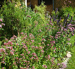 De fleste krydderurter er store og flotte i juli/august, og en del af dem står i fuldt flor. Det er en fornøjelse at se og høre insekterne sværme om blomsterne, som jo er fulde af nektar.
